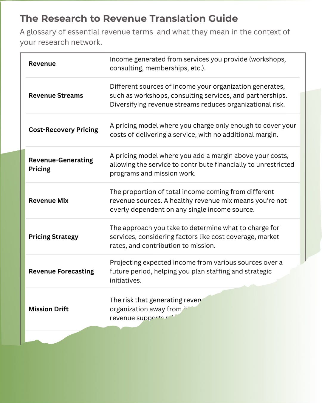 This is a reference page to save and open when you’re looking at your financials. It’s a glossary of essential revenue terms and what they mean in the context of your research network.