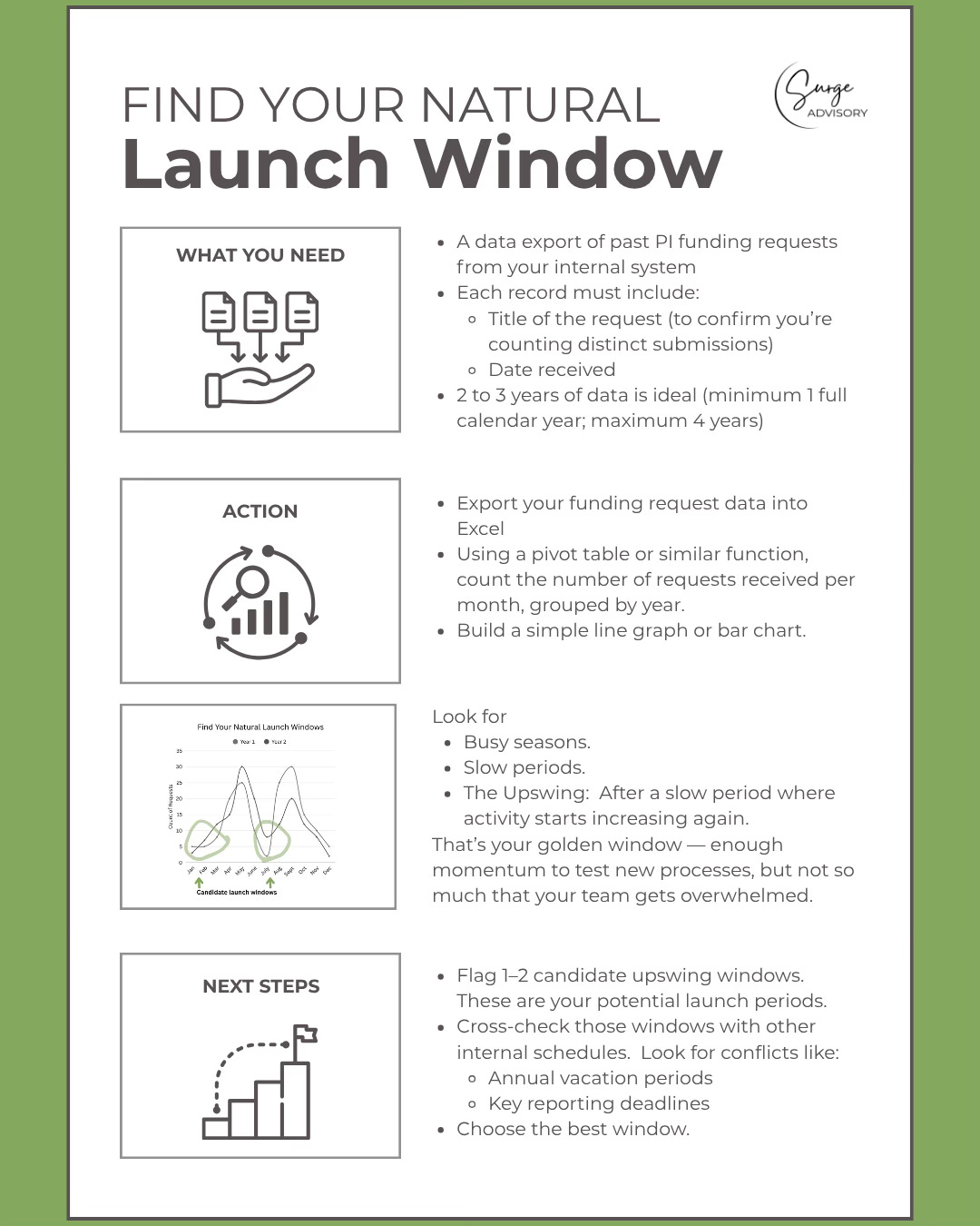 You can use your own data to find your natural launch windows. It’s a simple exercise to spot patterns (when funding requests are submitted), so you can choose a launch window when your team is ready and your partners are engaged.